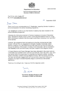 In a letter sent to John last month, Bridget Phillipson MP confirmed that Swinton’s rebuild is moving ahead with a project team now in place and work already underway within the Department for Education to progress the scheme. This comes after John wrote to the Secretary of State at the beginning of September here pressing for clarity on the plans to rebuild Swinton Academy.